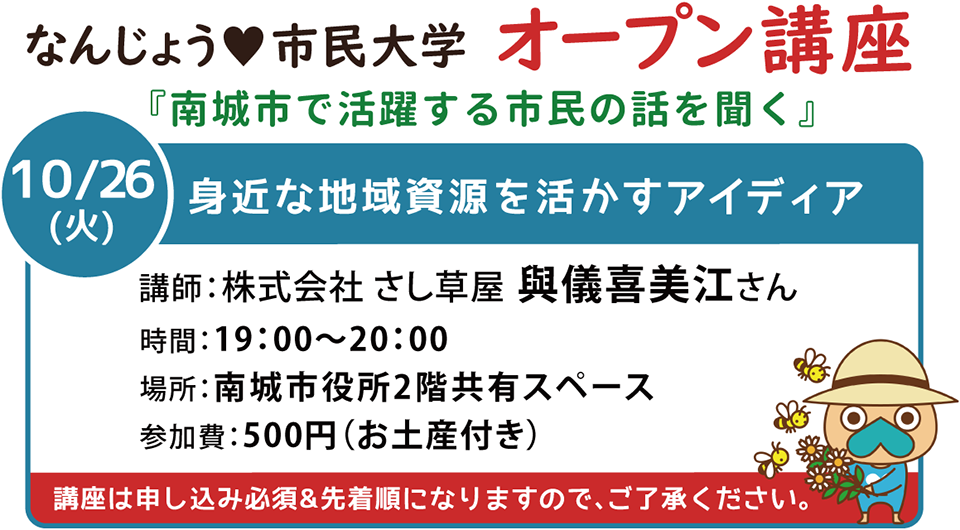 身近な地域資源を活かすアイディアと題して、講師に與儀さんをお迎えし、「さし草」に目を向けるようになったきっかけや「さし草」商品開発にまつわるお話をお聞きします。当日はさし草商品の販売もあります。