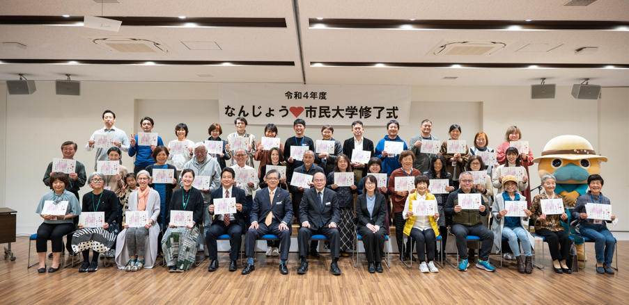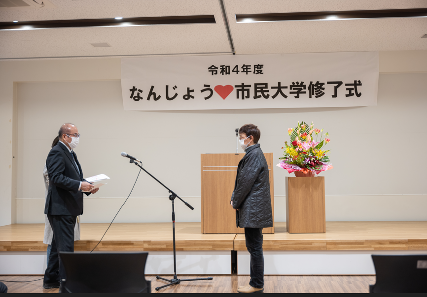なんじょう♥市民大学12期生・13期生の修了式を行いました。12期生は16人、13期生は27人の出席でした。今回修了したのは、12期生が21人、13期生が34人となりました。修了式は、開会の挨拶から始まり、活動報告、修了証授与、卒業生代表挨拶、閉会挨拶、記念撮影、12期生からのコメントという流れになりました。卒業生代表挨拶では、12期生の渡さんが、2年間の市民大学での活動と、チーム活動に参加して大変だったことや成果を話して下さいました。また、記念撮影には、なんじいも駆けつけてくれ、賑やかな雰囲気で皆さん写真を撮られていました。最後は、出席した12期生一人ひとりからコメントをもらいました。2年間の振り返りや個人の感想、仲間への感謝や13期生へのエールなど、皆さんそれぞれ個性の光るコメントをされていました。13期生も12期生のコメントに真剣に耳を傾けていました。