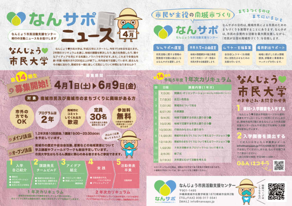 現在、市民大学14期生を新しく募集中です!南城市のまちづくりに興味のある方ならどなたでも応募OKですので、ぜひご応募ください!(募集期間:2023年 4月1日~6月9日)