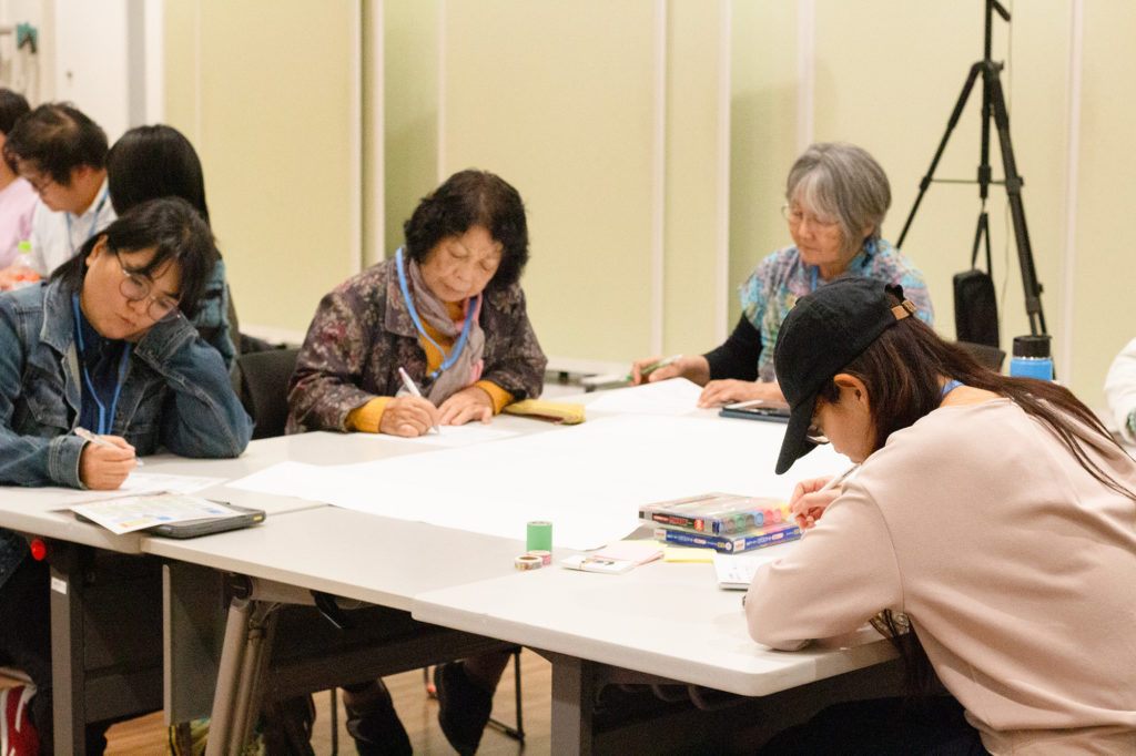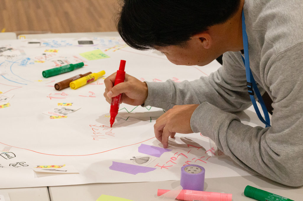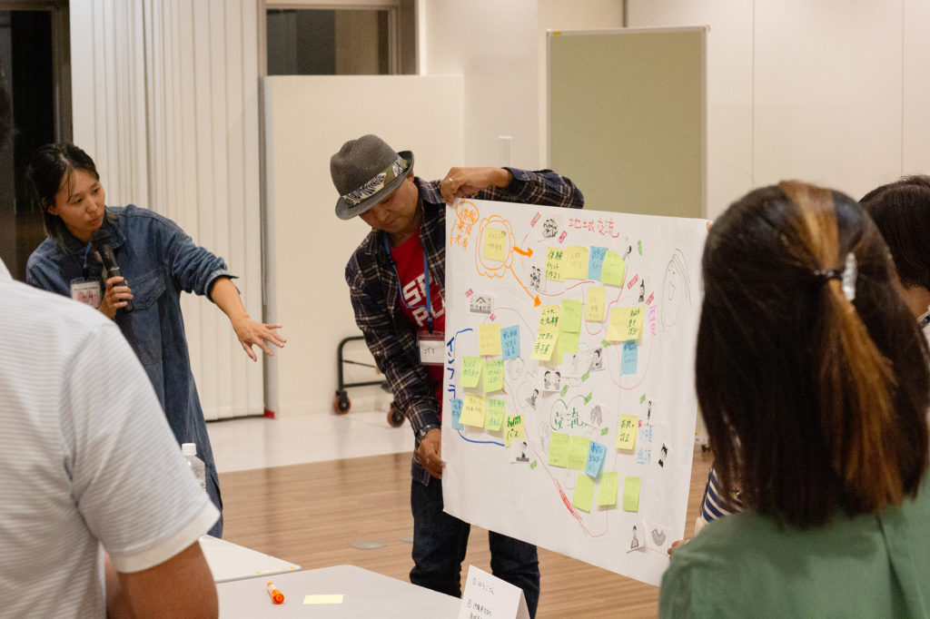 最後は、大きな模造紙に描かれた南城市のハート形マップに、付箋やイラストを使って未来の南城市を描き込みました。文字だけでなく、色や配置、イラストなども工夫しながら、それぞれのチームらしい未来像が形になっていきました。