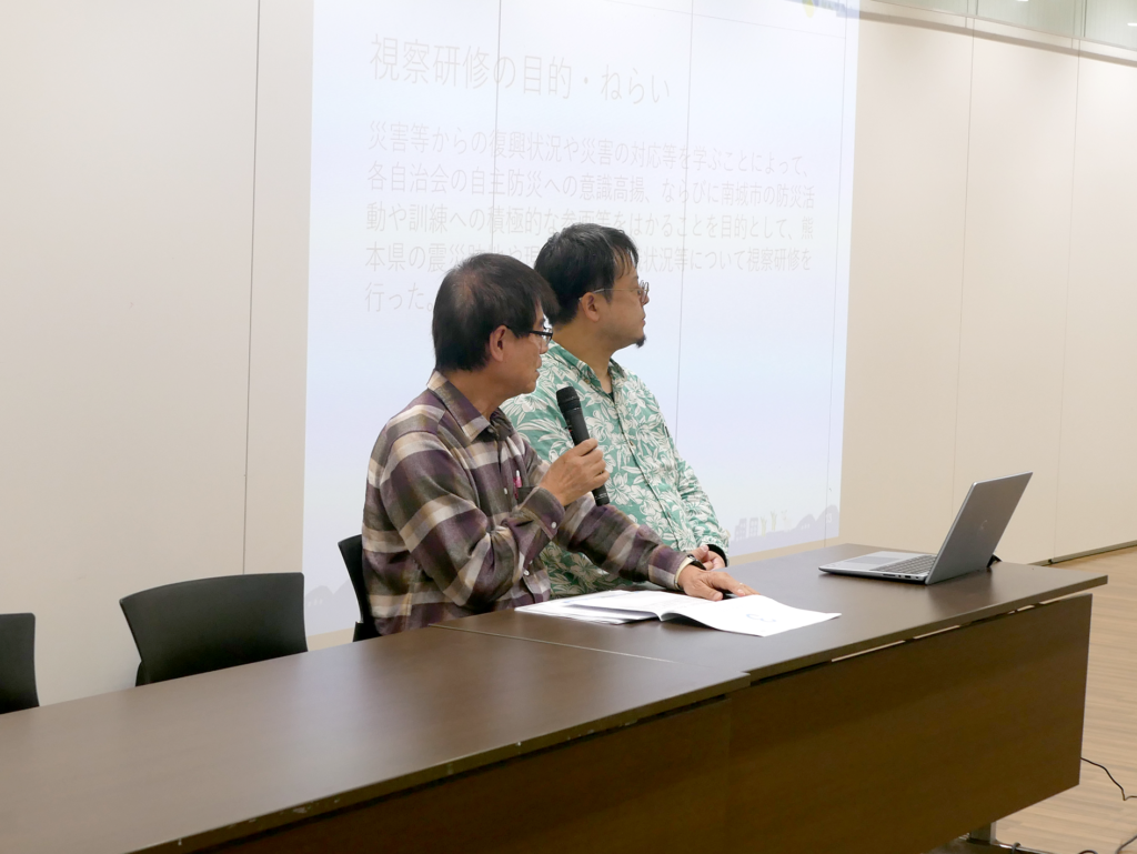 玉城地区の区長会では、「熊本県」を訪れ、震災の被害を受けた場所をメインに視察を行い、特に黒髪第4町内自主防災クラブによる講演では、実際に被災した当時の状況や、日頃の地域住民でのつながりや活動等の大事さを伺い、防災×地域について学ぶ機会となりました。